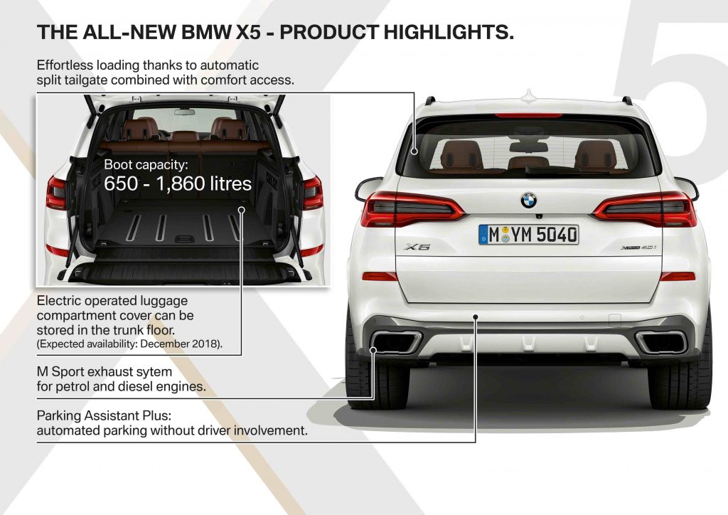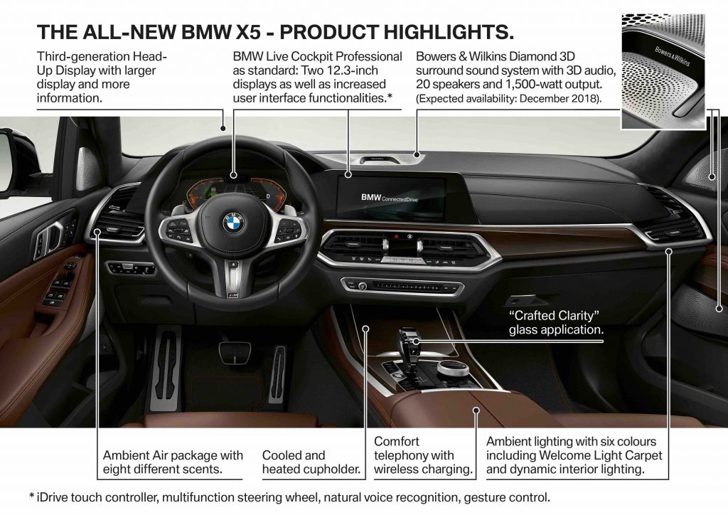 Définition par excellence du SUV premium, le X5 se situe désormais à la frontière avec la nouvelle gamme luxe délimitée par BMW. Il est en effet bâti sur la même plateforme que les modèles de cette gamme (la plateforme CLAR), et offre des équipements et services dont peuvent disposer aussi les propriétaires de Série 7, de Série 8 ou bientôt du prochain X7. Le nouveau X5 offre ainsi le pommeau de levier de vitesses en verre façon cristal, des feux laser (à partir du mois de mars) ou le tout nouveau toit SkyLounge avec des ampoules Led intégrés. BMW promet ainsi la multiplication de ce type d’ambiance personnalisée, relaxante.